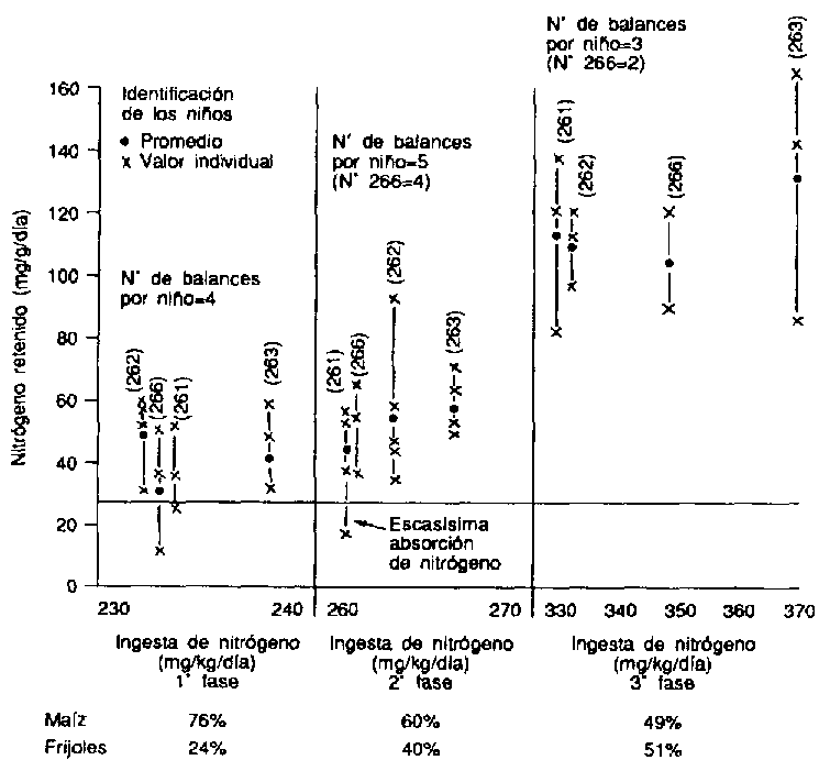 Las combinaciones de proteínas de maíz y frijoles, experimentadas con animales, aunque de valor proteico relativamente elevado, no sirven para tratar a niños con malnutrición proteica. Además, el aumento detectado por Arroyave et al. ( 1961 ) en los niveles de aminoácidos del plasma tras una alimentación experimental a base de leche fue muy superior, al cabo de un periodo de tratamiento con una combinación de maíz y frijoles del 1:1, a la respuesta observada cuando se suministraban proteínas lácteas tras un tratamiento con leche o con una mezcla vegetal formada por maíz, harina de semillas de algodón, levadura rotula minerales (Bressani y Scrimshaw, 1961). Estos autores confirmaron la insuficiencia de la dieta a base de maíz y frijoles. Del mismo modo, han resultado relativamente bajos los resultados en lo tocante al balance de nitrógeno obtenidos en niños alimentados con mezclas de maíz y frijoles, frente a los alimentados con leche y otras proteínas vegetales. Gómez et al. (1957) efectuaron experimentos sobre el balance de nitrógeno con ocho niños, de uno a cinco años de edad, que padecían desnutrición grave crónica, a quienes se dio una dieta de frijoles y harina de maíz. Tanto la absorción como la retención de nitrógeno fueron sumamente variables según los niños: cuatro registraron un balance de nitrógeno positivo y cuatro negativo. La adición de triptofano y lisina a la dieta de maíz y frijoles mejoró considerablemente la absorción y la retención de nitrógeno en cuatro casos. En dichos estudios, no se dio indicación alguna de las cantidades de maíz y frijoles mezclados, y la ingesta de proteínas varió de 1,53 g a 8,50 g al día. Frenk (1961) obtuvo asimismo resultados mediocres en niños alimentados con maíz y frijoles. Se consiguió una importante mejora al complementar esa dieta con harina de pescado.