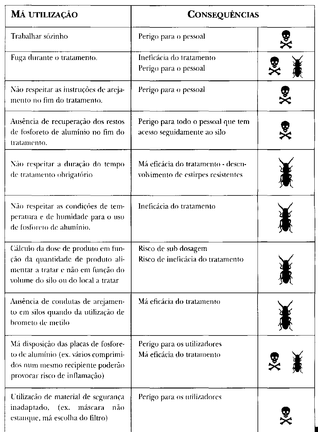 Devido a toxicidade para o homem dos fumigantes e' a sua dificuldade de utilização, nume rosos erros poderão ser cometidos aquado da sua aplicação. É indispensavel, por isso, chamar para a sua aplicção, pessoal dotado de um minimo de formação. Quando estas produtos forem utilizados, é preciso lembrar sempre que as más condições de utilização podem ter consequencias irreversiveis (quadro 4).