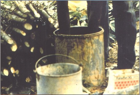 Em numerosos paises onde existe arma carencia de recipientes, existe habitualmente a tentação de recuperar os frascos de pesticidas para armazenar diversos produtos, tuis como, os produtos alimentares ou ainda água. Com o fim de evitar estas más práticas, é indispensável destruir as embalagens vazias e enterrálas, sobrecudo nunca as deitar para o lixo, tal como pode ser observado nalgumas situações (figura 6).
