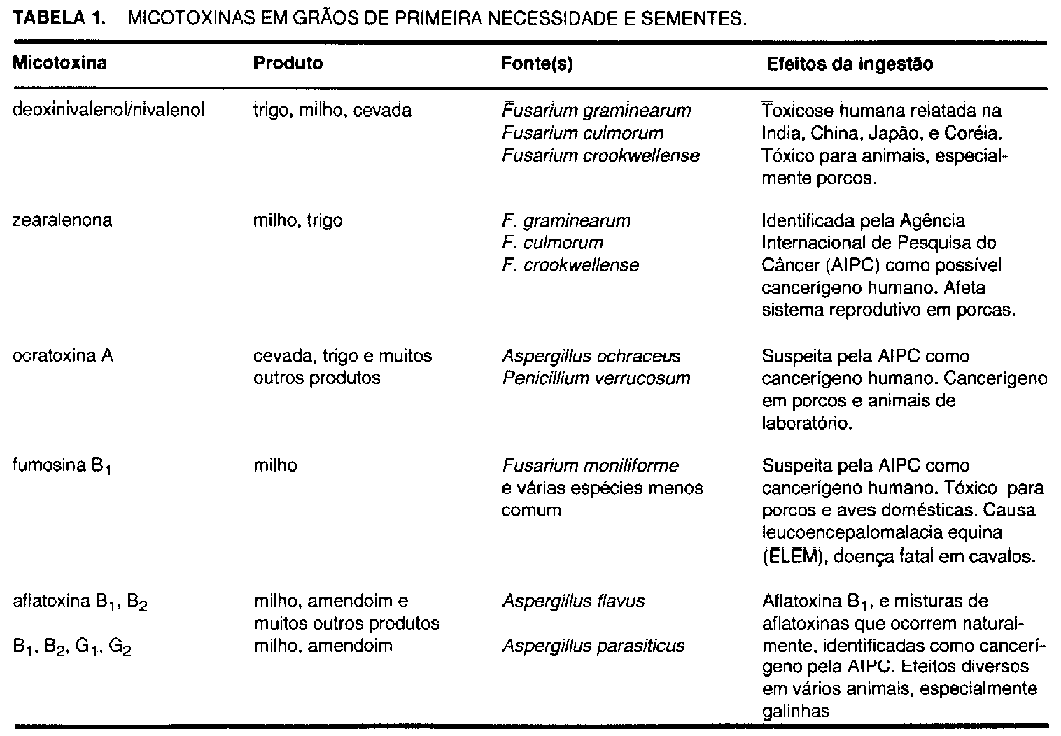 Há cinco micotoxinas, ou grupos de micotoxinas, que ocorrem com bastante freqüência em alimentos: deoxinivalenol/nivalenol; zearalenona; ocratoxina; fumosinas; e aflatoxinas. A tabela 1 resume os produtos alimenticios básicos que elas afetam, as especies de fungos que as produzem e os principais efeitos observados no ser humano e nos animáis. A toxina T-2 encentra-se também numa variedade de grãos, mas a sua ocurrencia, até hoja, é menos frequente do que as cinco micotoxinas anteriores.