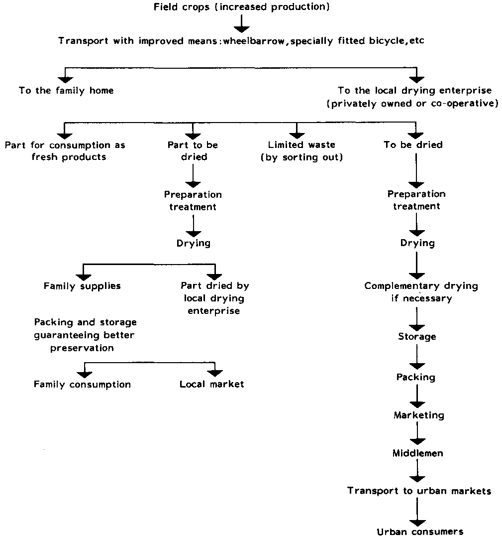 Cash crop products for industrial processing and eventual export are generally grown in large, well organised plantations. This applies to coffee, cacao, pineapple etc. Many horticultural products harvest especially garden vegetables, are produced as a family enterprise on small plots of land and with limited resources. These products are essentially grown for domestic consumption. The products that are used for drying are generally the surplus of fresh fruit and vegetables not consumed at harvest time. They constitute a reserve stock for off-season consumption. Small quantities, fresh or dried' not used for domestic consumption' are sold on local markets by women in order to obtain cash. These quantities are generally limited to the weight a woman can carry on her head in a basket, about 10-15 kilos. Most horticultural products are cultivated without the use of draught animals or tractors.