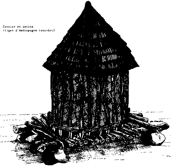 Dans le Mono, on observe deux types de structures de stockage. L'une, appelée Sagada, est un genre de crib cylindrique, fait de matériaux végétaux à base de nervures et de feuilles de palmier. L'autre, appelée Bliva, consiste en une plate-forme circulaire, confectionnée en nervures de palmes et soutenue par des pilotis en bois (branches d'un arbuste de bas-fonds, appelé communément Erétrine). Les épis de mais non déspathés, entassés sur une hauteur de 1,5 m environ, sont minutieusement superposés à la périphérie en couches circulaires pour former un cylindre très ferme, parfaitement stabilisé sur une hauteur de 1,5 m environ. Des cerclages en fibres végétales, répartis par hauteurs de cinq couches d'épis, maintiennent solidairement l'ensemble. Un toit en paille, débordant largement le stock, assure une protection efficace contre la pluie (cf. figure A.1) 1/.