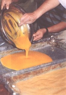 Distribución de la mezcla de mango y maracuyá en bandejas (G. Paltrinieri)
