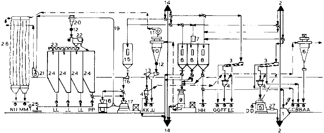| 11 Ventilateur | 26 Filtre à manche | LL Farine |