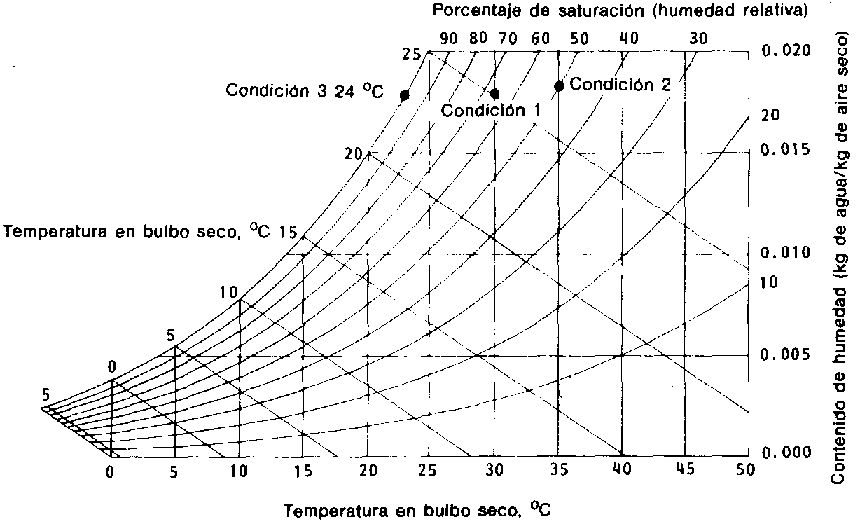Las relaciones entre temperatura y humedad son complejas, pero pueden representarse mediante ecuaciones matemáticas, lo que permite calcular los efectos de la variación de cualquiera de los factores, o también mediante una tabla psicrométrica