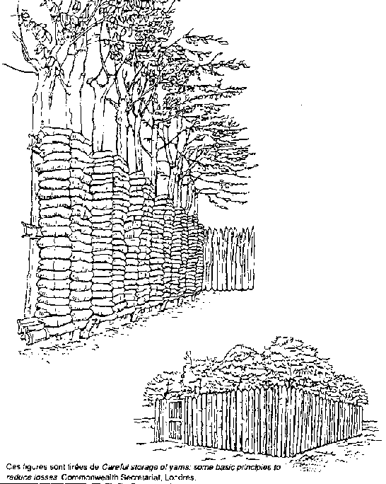 En Afrique occidentale, les «greniers», à ignames sont une méthode d'entreposage très répandue. Il s'agit de constructions verticales sur lesquelles on attache les ignames une par une (figure 45). Les montants qui supportent les cadres sont coupés dans la brousse à 2 m de hauteur ou davantage. L'emploi de pieux qui prendront racine et mettront les ignames à l'abri d'une frondaison de feuilles est intéressant. Ces pieux seront en outre moins sujets à la décomposition ou aux attaques des termites. Les greniers à ignames peuvent être entourés d'une palissade pour éloigner les rats.