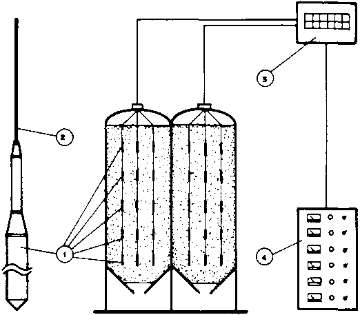 Sondas y sus posiciones en un silo: I Sondas; 2 Cable, 3 Caja de conexión; 4 Tablero de control.