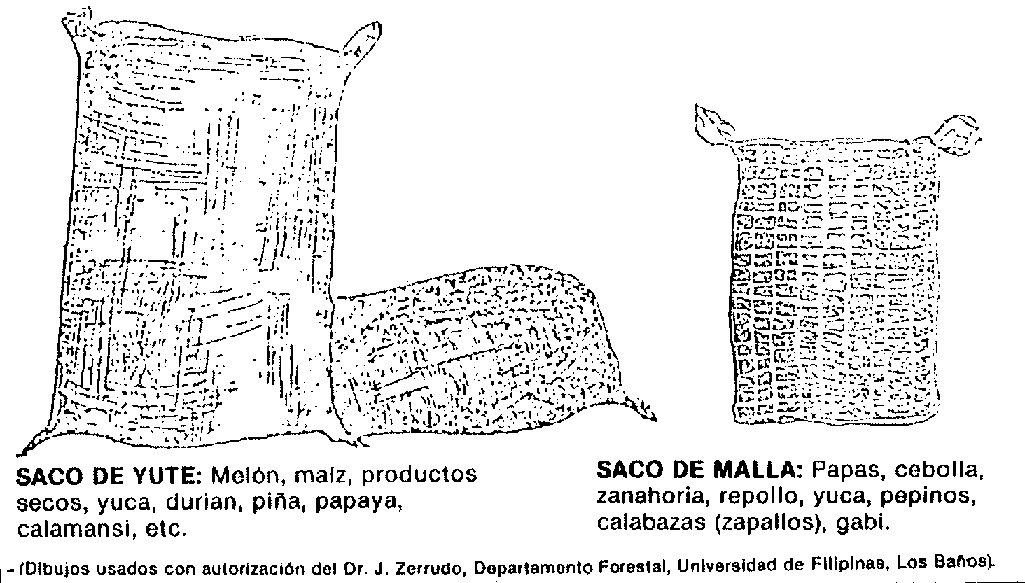Bolsas o redes. Pueden venir en gran variedad de tamaños, formas y resistencias y pueden fabricarse a partir de fibras naturales o sintéticas. En las figuras 41 y 42, se muestran algunos ejemplos. Tienen las ventajas de ser livianas, a menudo re-usables, pueden fabricarse localmente y a bajo costo. Sus principales desventajas son: