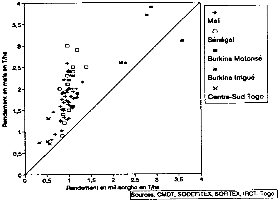 L'avantage du maïs par rapport au mil-sorgho tient en premier lieu à son caractère productif: donnant un rendement nettement supérieur, le maïs permetä généralement une productivité du travail plus élevée, même si sa culture exige une charge de travail sensiblement plus lourde que celle du mil-sorgho (le mil-sorgho pouvant s'accommoder d'un moindre entretien).