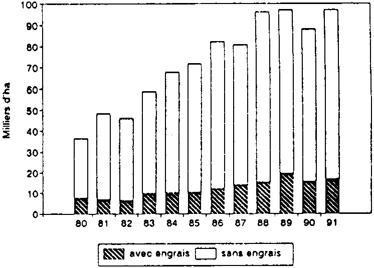 Au Sénégal et au Cameroun, l'utilisation des engrais apparaît limitée (moins de 10 000 ha en 1991) du fait d'abord de la faible extension de la surface en maïs encadré. On constate une progression rapide de la surface avec engrais au Sénégal, contrairement au cas du Cameroun où les engrais ont pourtant été subventionnés et fournis à crédit jusqu'en 1991.