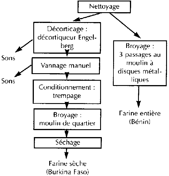 A Ouagadougou (Burkina Faso), SOMDA (1988) a recensé de façon exhaustive 181 productrices-vendeuses de farines de céréales, qui transformeraient en moyenne 3 tonnes de céréales par jour; les produits principaux sont les farines fines séchées de maïs blanc et de sorgho. Elles sont obtenues (figure 6) par décorticage mécanisé, à l'aide d'un appareil de type Engelberg, trempage du grain décortiqué puis broyage au moulin à disques. Les farines fines obtenues sont alors séchées avant leur vente au marché. La clientèle est essentiellement constituée de jeunes couples et de couples de fonctionnaires. De façon similaire, à Abidjan, FUSILLIER (1991) a recensé 81 productrices-vendeuses de farines dont le produit principal est une farine, de maïs cendrée (par adjonction de cristaux de potasse).