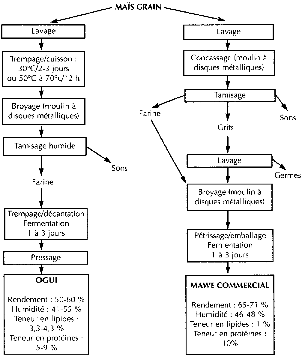 Dans le golfe du Bénin, et à Cotonou en particulier, près de 50 % du maïs est broyé sous forme humide afin de donner des pâtes fermentées appelées ogui et mawè (figure 7) qui sont la base de nombreux plats. Le mawè occupe une place particulière; en effet, 50 % du mawè fabriqué est commercialisé comme produit intermédiaire (tableau V).