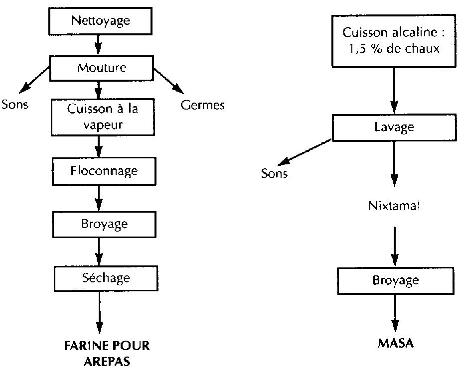 Il existe en Amérique latine deux farines de maïs précuites produites de manière industrielle ou semi-industrielle: la masa, ou farine nixtamalisée, et la farine pour arepa (figure 8).