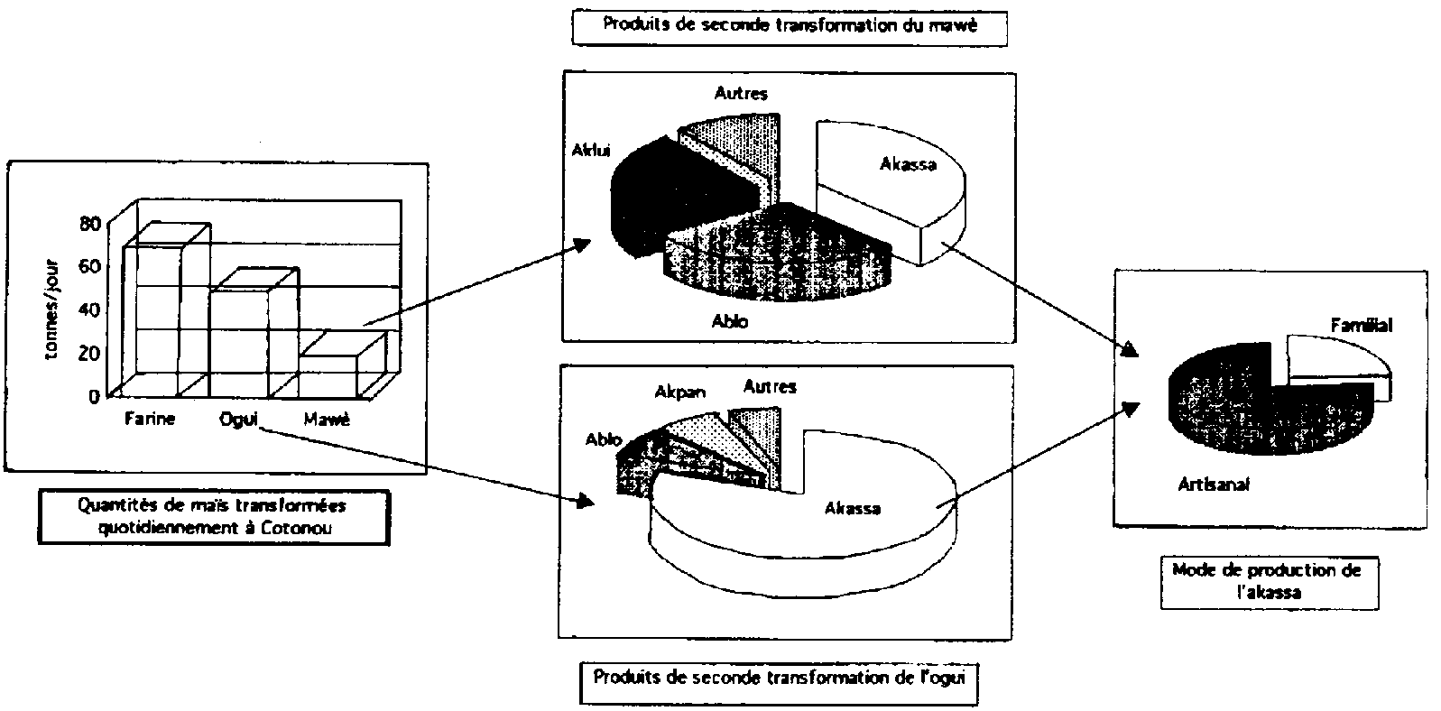 L'akassa est une pâte cuite fermentée, produite à partir du mawè ou de l'ogui.: après cuisson de la pâte fermentée, le produit est façonné en boule et enveloppé dans des feuilles de teck, de Sterculia tragencata ou de Thalia weltwitshi. Il s'agit d'un produit très largement diffusé (les trois quarts des pâtes fermentées sont destinés à cette production), et qui fait l'objet d'un commerce florissant à Cotonou: NAGO et HOUNHOUIGAN (1990) ont ainsi dénombré plus de 1 300 productrices-vendeuses d'akassa qui transforment quotidiennement près de 33 tonnes de maïs, soit un quart environ du maïs transformé quotidiennement à Cotonou, toutes utilisations confondues (figure 9). On voit donc bien par cet exemple l'importance de l'artisanat alimentaire dans l'alimentation quotidienne des urbains.