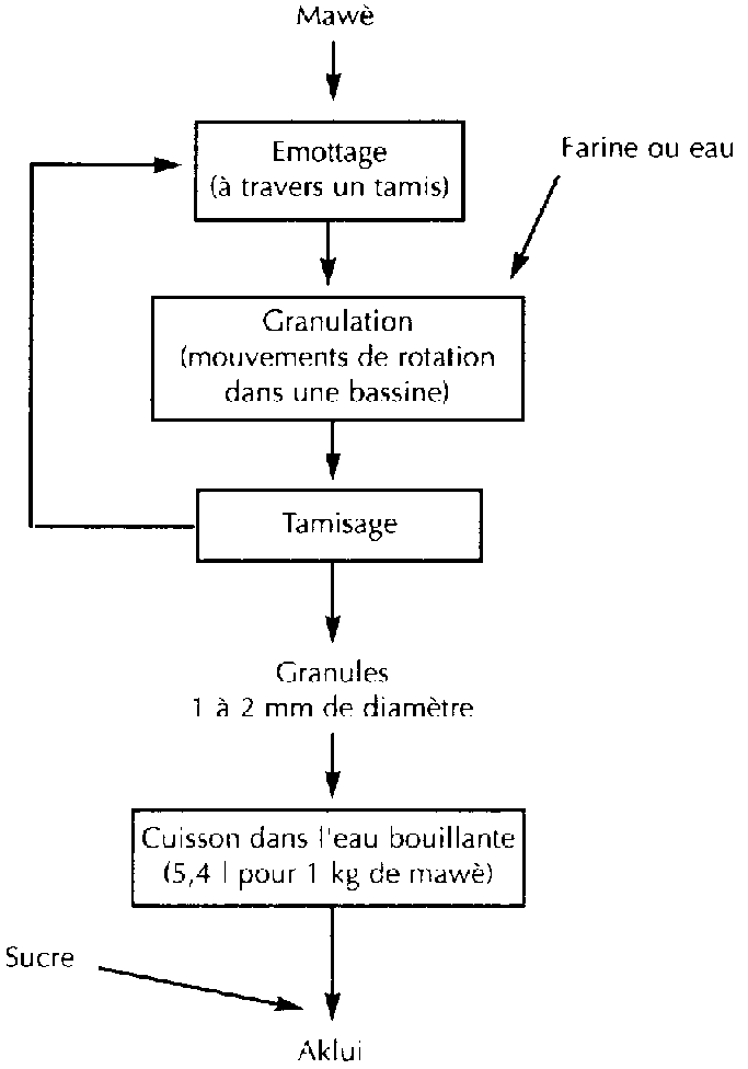 Les bouillies parsemées de granules tel l'aklui au Bénin, le moni au Mali ou l'arraw au Sénégal sont avant tout des produits de petit déjeuner. L'aklui est fabriqué à partir du mawè, par granulation de celui-ci puis cuisson en eau bouillante (figure 10). A Cotonou, l'aklui est le deuxième plat le plus consommé le matin après le riz (ALEXANDRE et al., 1993); 200 productrices-vendeuses se consacrent quotidiennement à ce produit (NAGO et HOUNHOUIGAN, 1990). La vente s'effectue aussi bien dans la rue qu'à domicile. Mais, dans tous les cas, il s'agit d'un achat individuel et non familial (ALEXANDRE et al., 1993). La grande majorité des femmes (86 %) préféreraient acheter ce produit plutôt que de le fabriquer; une partie seulement des femmes possède le savoir-faire nécessaire.