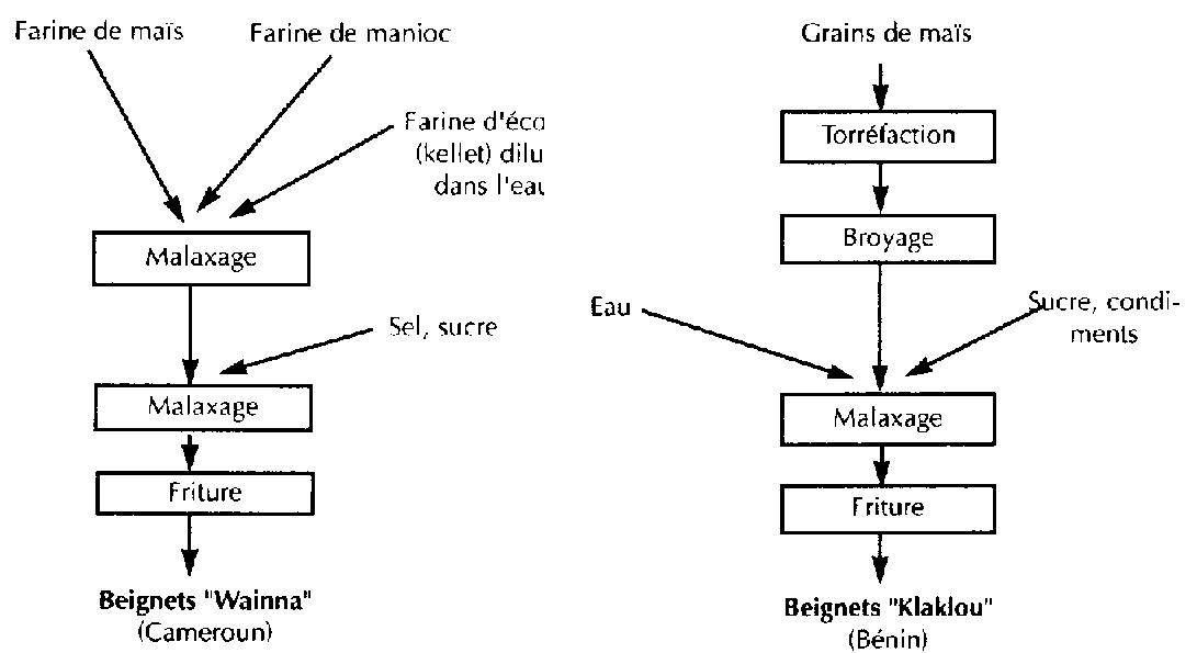 Les beignets à base de maïs sont fréquemment consommés comme produit de grignotage ou comme petit déjeuner au Bénin ou au Cameroun. Il existe de nombreuses recettes (figure 11) utilisant un mélange de farine de maïs, avec de la farine de banane et/ou de la farine de blé ou nécessitant l'emploi d'une poudre d'écorce séchée (Kellet) ayant des propriétés visco-élastiques.