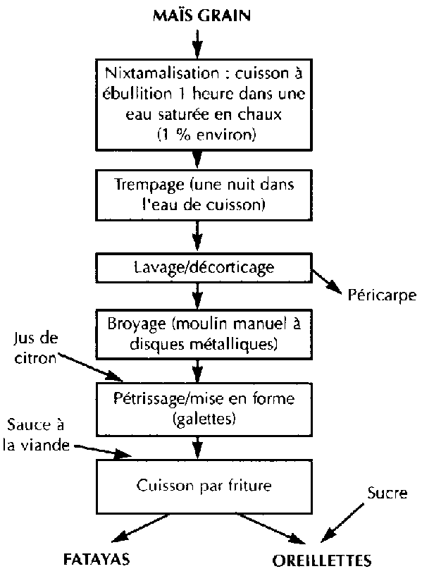 A Ziguinchor, au Sénégal, la production de beignets de maïs nixtamalisé a récemment été développée (MESTRES ET FERRÉ, 1993). Des produits originaux salés ou sucrés frits (figure 12) ont en particulier été créés pour répondre à la demande locale, qui était réticente au goût spécifique des produits nixtamalisés. Les produits obtenus sont vendus à la fois en poste fixe, dans un kiosque, et en vente ambulante. Le développement de tels produits se heurte toutefois encore au problème de broyage du grain nixtamalisé, très délicat à réaliser à l'aide des moulins de quartier (à marteaux) disponibles sur place.