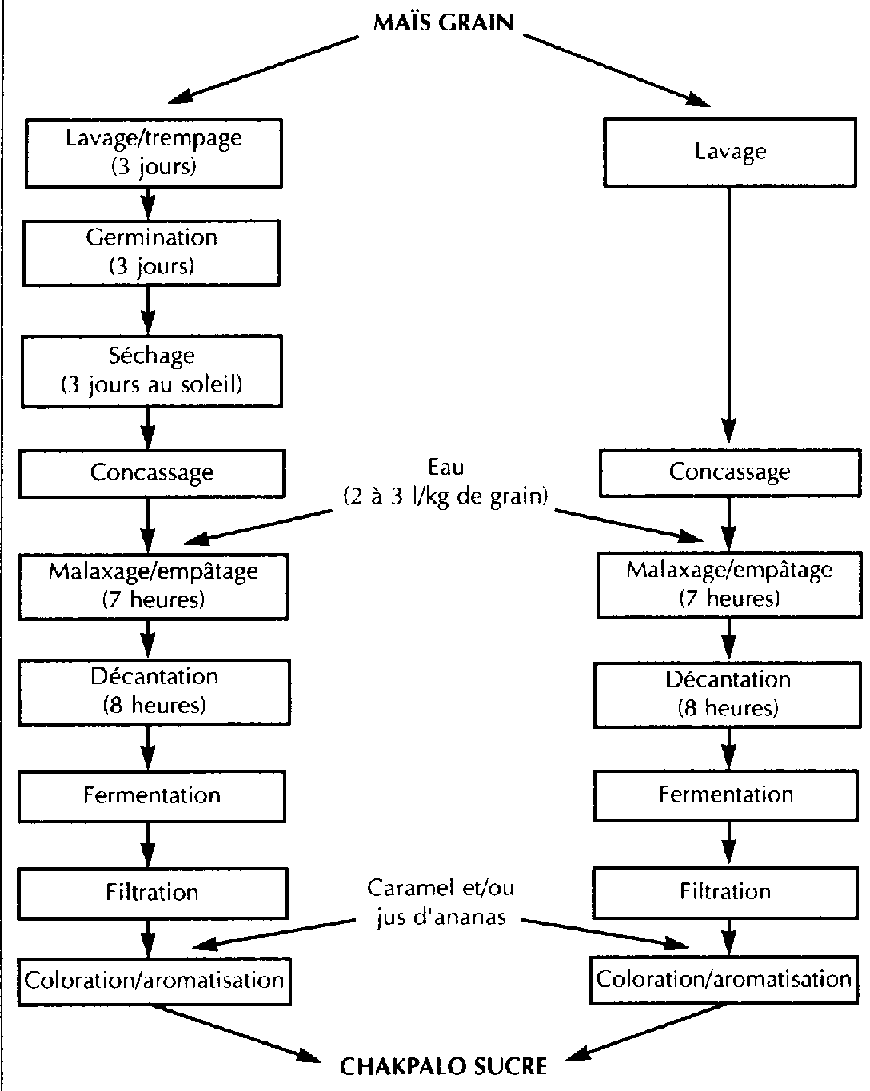 Les bières peuvent être produites artisanalement ou de manière industrielle. Du fait de cette concurrence, on assiste, à Cotonou par exemple, à une diminution du marché des produits artisanaux (DEVAUTOUR, 1990), Les productrices-vendeuses se sont alors tournées vers un marché moins concurrentiel, celui des sodas. Elles ont ainsi modifié leur protocole de fabrication (figure 13), développant un nouveau produit, le chakpalo sucré, qui touche une clientèle plus vaste que celle des bières, en particulier les femmes et les enfants.