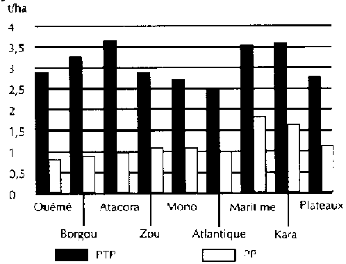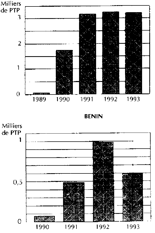 Entre 1989 et 1993, plus de 13 500 PTP ont été réalisées au Bénin et au Togo (figure 1). Autant de paysans ont pu tester la technologie et se faire une idée exacte des possibilités à leur portée. Le suivi de ces milliers de parcelles de test de production a permis de confirmer l'engouement et le dynamisme des paysans pour une approche parcitipative et programatique, mais aussi de déceler les faiblesses du système d'exploitation traditionnelle, surtout l'échec de la culture itinérante
