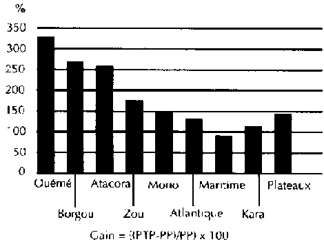 La performance des PTP a été supérieure à celle des parcelles traditionnelles, de façon consistante, à travers les deux pays. Un rendement moyen global de 3 000 kg/ha a été obtenu sur les PTP, comparé à presque 1 000 kg sans le paquet technologique, donnant un gain net de 200 % (figures 3 et 4). Les régions du nord du Bénin et du Togo ont eu de meilleurs rendements que celles du sud. Dans l'Atlantique, le Mono et l'Ouémé, l'effet de l'application de l'engrais a été mesuré avec la variété DMR-ESRW. La différence entre l'utilisation de la variété améliorée et l'utilisation de la variété améliorée + NPK n'a pas été significative. L'apport supplémentaire d'azote (urée) s'avère nécessaire pour obtenir le bénéfice complet du paquet technologique. Le DMR sans engrais a donné 1 978 kg/ha, 2 165 kg/ha en ajoutant du NPK, puis 2 971 kg/ha en ajoutant en plus de l'urée.
