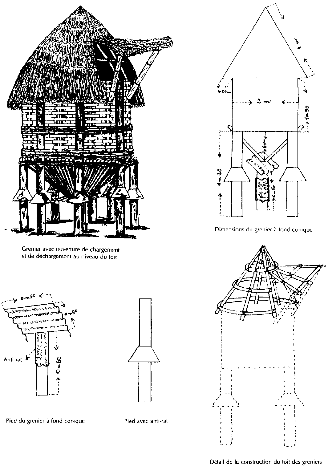 Ce projet, qui a pour objectif principal la promotion du stockage des produits vivriers sous le contrôle et la gestion des producteurs et petits commerçants, a permis de concevoir et de choisir des structures (figures 4 et 5) et des techniques améliorées de stockage-conservation dans 3 zones pilotes. La démarche adoptée a été de partir de l'existant pour l'améliorer et ce, en tenant compte d'une part des faiblesses décelées dans les structures et les techniques existantes, et d'autre part, des souhaits d'amélioration exprimés par les paysans.