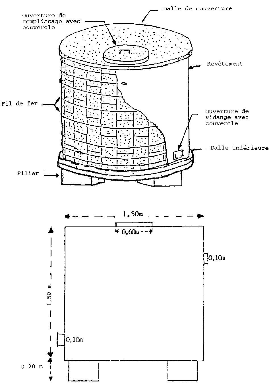 Deux ouvertures sont aménagées, une première d'environ 0,60 m de diamètre sur la dalle supérieure pour le remplissage du silo et une deuxième vers le bas du silo pour la vidange. La capacité des silos vulgarisés varie entre 2 et 4 tonnes de maïs grains. Les grains avant le stockage doivent être secs et le stock constitué doit être traité avec du phosphore d'hydrogène (PH3). La durée de stockage est d'environ 6 mois (figure 4).