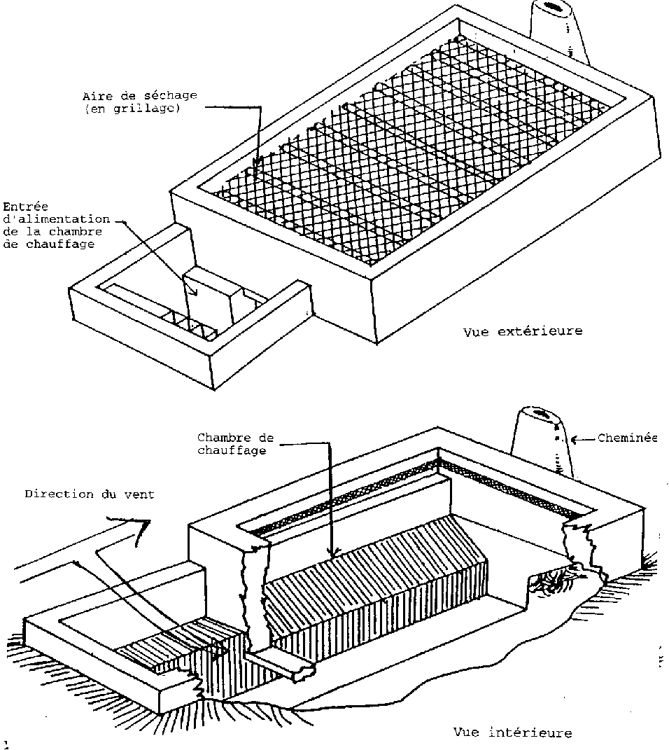 Le foyer est alimenté par du bois de chauffage ou par des rafles de maïs. Les grains de maïs à sécher sont étalés sur le grillage et reçoivent ainsi par convection la chaleur qui vient de la chambre de chauffage (figure 5).