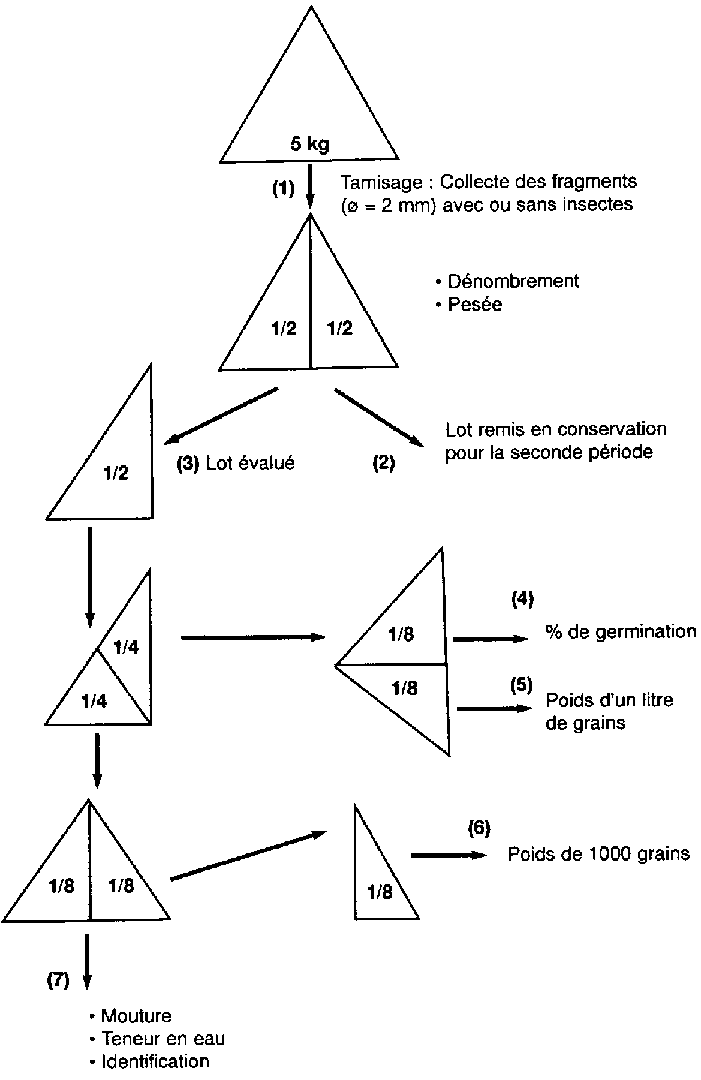 A la fin de la première période de conservation, l'obtention des sous-échantilIons s'est faite pour chacune des unités expérimentales suivant la méthode de cône (BOXALL, 1986), après tamisage à travers un tamis à mailles de 2 mm de diamètre (figure 1). Diverses observations faites et présentées dans ce document concernent la population d'insectes, la quantité de particules fines produite, le pourcentage de germination et de grains moisis et la distribution des particules de farine issues des produits conservés. La germination des grains est testée en les ensemençant en deux échantillons de 100 grains (par traitement) dans du coton hydrophile imbibé d'eau distillée. Le tout est recouvert de papier aluminium en vue de limiter l'évaporation rapide de l'eau. Toutefois, les grains sont dévoilés deux fois par jour pour l'aération. Le grain a germé lorsque la radicule visible atteint une longueur d'au moins 10 mm.