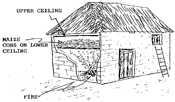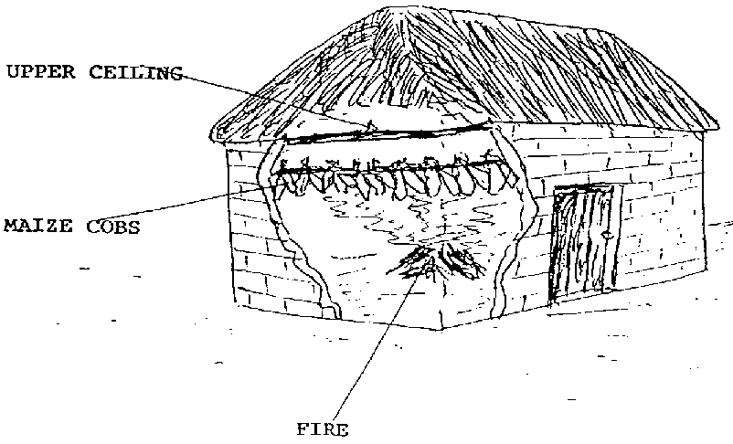 The maize cobs are picked by hand from the plant and the outer sheaves of each cob are stripped off and discarded, leaving the tightly clasping inner sheaves intact around the cob. The partially dehusked cobs are then carried home in baskets and placed within a structure called a "banda", or kitchen ceiling (figure 1). Normally the cobs are spread out evenly over this ceiling to form a layer of not more than 30 to 40 cm, for adequate drying. Drying is then carried out with supplemented firewood heat provided by a strong fire, which is kept continuously burning in the kitchen for at least two weeks after harvest. It is believed that the smoke of the family's cooking fire has a repelling effect against insects.