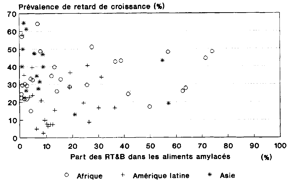 La contribution des RTB aux DEA totales a donc tendance à être plus importante dans les pays où le PNB par habitant et les DEA totales sont les plus faibles, c'est-à-dire les pays les plus déshérités. Toutefois, lorsque l'on met en relation la prévalence de retard de croissance (Taille/âge; % < - 2 écart-type) chez les enfants d'âge préscolaire dans les pays en développement (de ONIS et al., 1993; FAO, 1996) avec la part de l'énergie disponible à partir des amylacés provenant des RTB (figure 7), on constate que les pays à forte consommation de RTB ne sont pas ceux où la malnutrition est la plus importante: la prévalence de retard de croissance, qui peut être considérée comme un bon indicateur synthétique de la situation nutritionnelle d'une population, est généralement moins élevée parmi les populations d'Afrique centrale, fortement consommatrices de manioc, que parmi celles de nombreux pays asiatiques consommant principalement du riz.