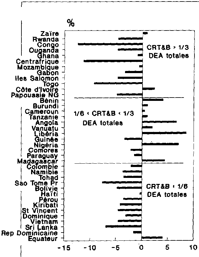 Lorsqu'on examine les variations au cours des 12 dernières années de la contribution des RTB aux DEA totales dans les 38 pays pour lesquels cette contribution était supérieure à 10% dans la période 1980-1982 (figure 9), on constate que cette contribution a augmenté dans 12 pays (10 pays africains, le Vanuatu et l'Equateur) alors qu'elle a diminué dans les 26 autres (13 pays africains, 8 pays d'Amérique latine, 3 Îles du Pacifique et 2 pays asiatiques). Ces variations, qu'elles soient négatives ou positives, peuvent être considérables au Congo, la contribution des RTB aux DEA totales est passée de 52% à 40% au Liberia, elle a augmenté de 22 à 31%.
