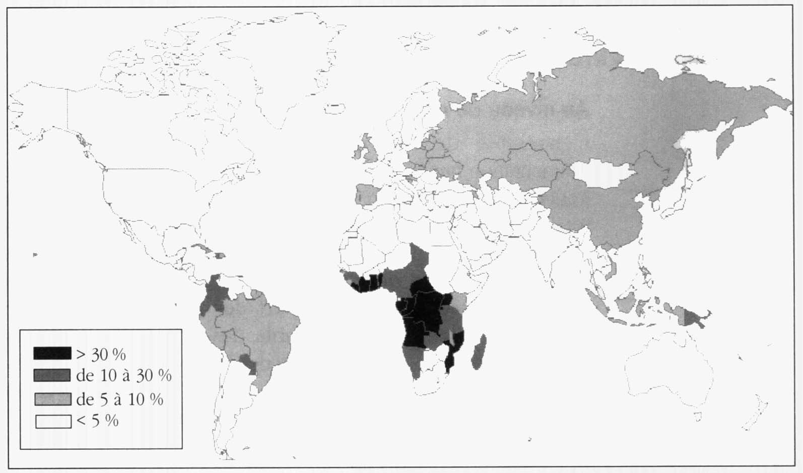 La contribution des RTB aux DEA totales dépasse 30% dans 13 pays (12 pays africains et les Iles Salomon); elle se situe entre 10 et 30% dans 18 pays (Il pays d'Afrique, 5 pays d'Amérique latine et 2 îles du Pacifique) et entre 5 et 10% dans 43 pays (figure 5).