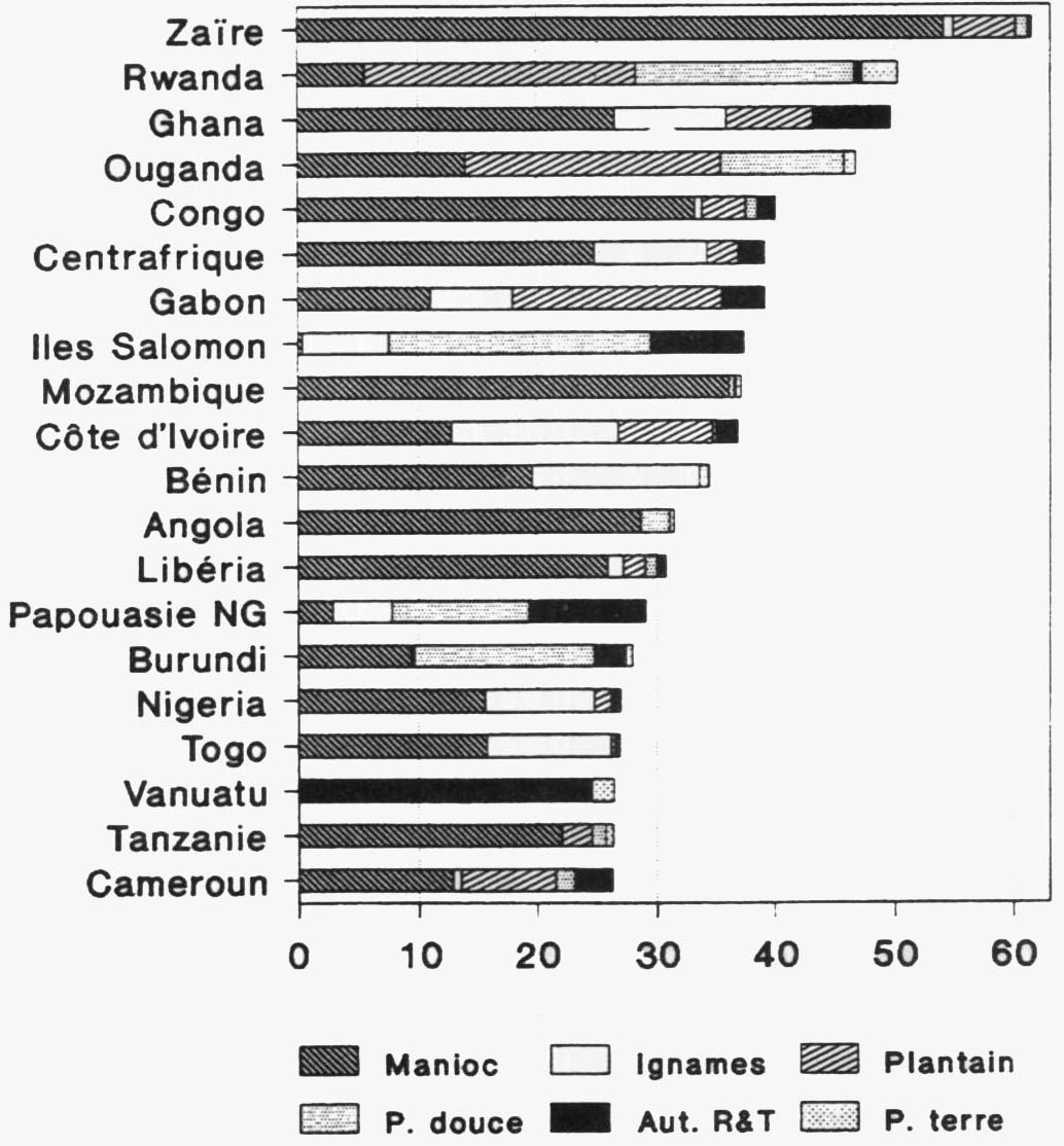 Parmi les 20 pays dans lesquels la contribution des RTB aux DEA totales dépasse 25%, l'espèce la plus consommée est le manioc dans 12 pays; au Zaïre, il constitue à lui seul 54,1% des DEA totales. Le plantain est l'espèce la plus utilisée au Rwanda, en Ouganda et au Gabon. La patate douce est prépondérante aux îles Salomon, en Papouasie Nouvelle-Guinée et au Burundi. Les ignames devancent le manioc et le plantain en Côte d'Ivoire. Les espèces secondaires de R&T constituent de loin la plus importante source énergétique au Vanuatu.