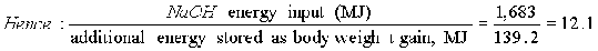 The MJ of NaOH energy input per MJ additional energy stored as body-weight gain was calculated as follows.