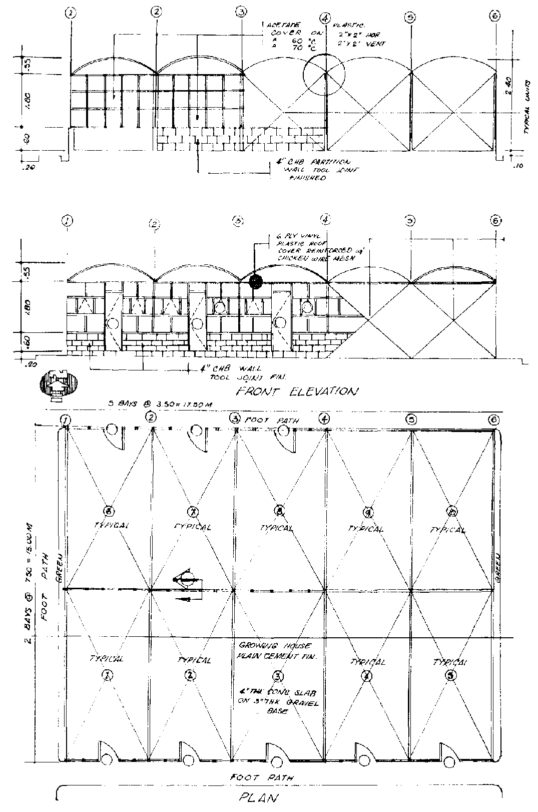 The growing houses consist of a concrete floor set on a gravel base, four layers of hollow blocks set on the floor, wooden frames, plastic walls (gauge 6), plain galvanized sheets for roofing, and a plastic screen for ventilators (Figure 2).