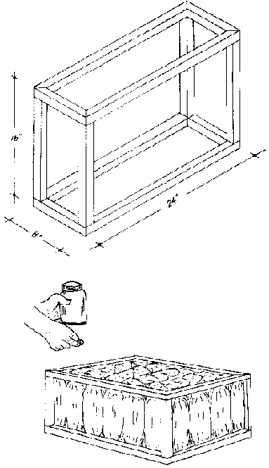Simultaneously with the bed preparation, several crumpled newspapers are soaked in a container with 3 9 of urea per gallon of water. This "fertilized" paper is planted along with the mushroom spawn or seed. The mushroom spawn and soaked paper are first distributed on top of the layer in thumb-sized pieces. The plantings are 5 - 8 cm from the edge of the straw and 5 cm apart. For every six-layer bed 4 m long, three bottles (16 fl. oz.) of spawn are used. One-half bottle of spawn is apportioned to plant one layer. The spawn is buried with the paper 4 cm deep in the layer. The same procedure is repeated on the remaining layers. Any left-over straw is mounded on top to a thickness of about 10 cm at the centre.