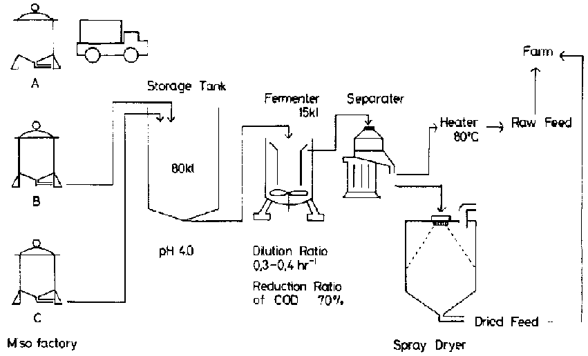 As shown in Figure 1, soybean cooking waste is sent to the factory by tank trucks or pipelines directly from the miso factory cookers. After the pH value is adjusted to 4.0 in a serving tank, the waste is transferred into a Waldhof continuous fermenter of 15 kl capacity. In the fermenter, Torulopsis xylinus is cultivated, with an anti-foaming agent, at 30°Cat a dilution rate of 0.3 - 0.4 hr(-1) without any other nutrient supplements. Maximum production of dehydrated yeast is 800 kg when 80 tons of waste are supplied and COD is reduced by 70 - 75 per cent. For purpose of lowering production costs, the yeast milk, after washing and heating at 80°C for 30 min., is often delivered to neighborhood farms.