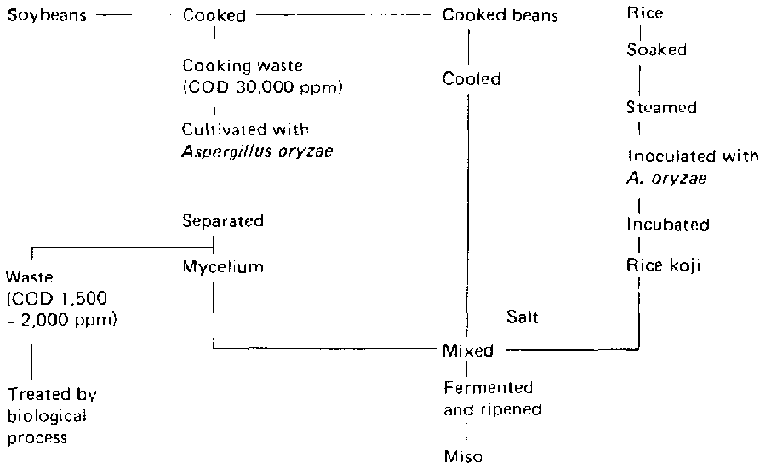 The utilization of the wastes from the food industries is beset with many problems, among which economic feasibility is of prime importance, particularly for comparatively smallscale factories. As an example of one solution for coping with these problems, the use of soybean cooking waste as a substrate for koji-mould cultivation was investigated. The biomass obtained contributed not only protein and other nutrients, but also enhanced enzyme activity for the fermentation of miso, thus providing an apparent economic advantage.