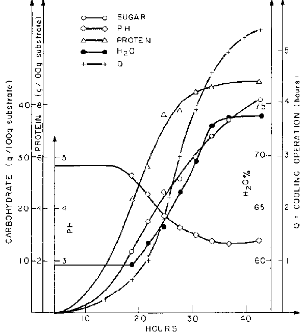 The kinetics of a fermentation on potato waste are shown in Figure 1, illustrating the production of protein, reducing sugars, water content, and the pH of the preparation. The curve, marked by crosses, is of special interest. It shows that, during a total incubation time of 30 hours, the monitoring devices for mechanical stirring and water spraying had to operate for only five hours, thus demonstrating the excellent efficiency of the cooling device. Additionally, it requires a remarkably low expenditure of power, a fact of obvious importance in regard to the production cost of solid state fermentation and to its economic feasibility at the farm level in tropical regions.