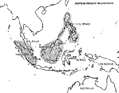Kalimantan. It remains an important food resource for some hill tribes, although with the spread of Islam, attitudes toward pork are changing in some areas. The Malayan subspecies (Sus barbatus of) is now rare in the Malay Peninsula. It is also becoming rare in Sumatra as the lowland forests are logged and broken up by commercial interests and as the human population expands. The status of the three Philippine subspecies is currently unknown.