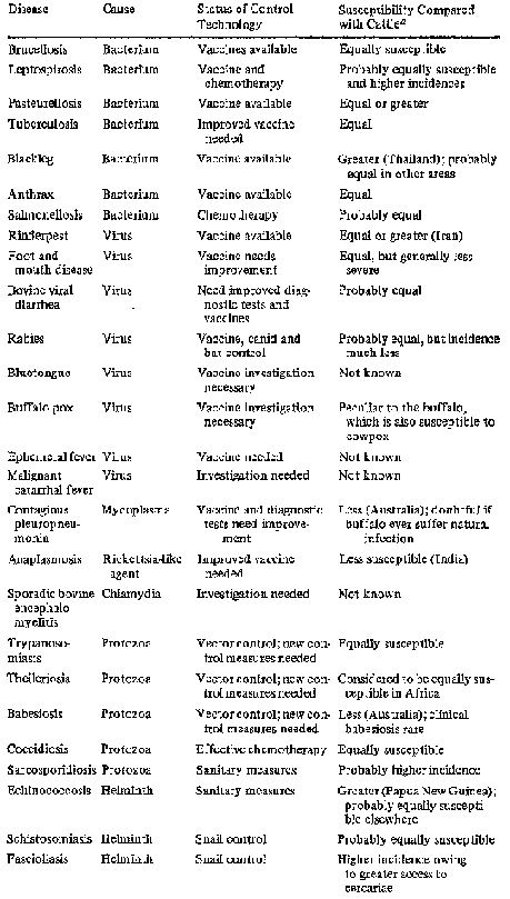 Other Diseases -Among the epizootic diseases, rinderpest and piroplasmosis seem to affect buffaloes as much as cattle. Foot-and-mouth disease also affects buffaloes, but to a lesser degree than cattle, producing smaller lesions and having a lower incidence. In northern Australia buffaloes deliberately infected with bovine pleuropneumonia bacteria exhibited slight fever, but the disease never appeared. No naturally occurring eases have been reported in buffaloes.