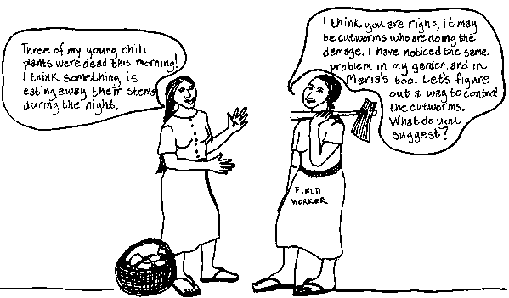 We feel very strongly that the first thing any garden project field worker should do is try to grow a garden just as the people in the community do. If there are no local gardens then the field workers garden should use only resources that are readily available to local households. By doing this she gains an understanding of gardening conditions in the area, including local resources, skills, and problems. She also demonstrates that local people are the focus of the project and that she recognizes their skills and knowledge. Only then will she begin to appreciate local conditions and be able to work with gardeners or those interested in gardening to support and improve gardening in the community.