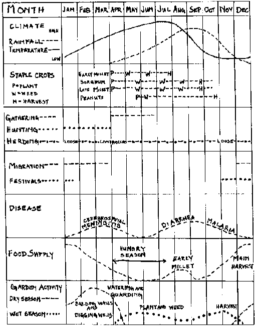 A good way to understand seasonality is to make an annual calendar showing variations through the year. Figure 4.4 is an example of an annual calendar for northeast Ghana. It is best to begin by quickly gathering preliminary information, entering it on the calendar, then deciding what additional information is needed (Box 4.3). This is a good safeguard against wasting time making a calendar much too elaborate for practical use. A number of smaller calendar forms can be used for taking notes, and the information can be put together later on a larger sheet of paper.