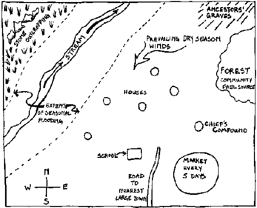 Making a sample map of an area with community members is a good way to become familiar with the location of natural and social resources. Most available maps will probably be on too small a scale to be useful for village-level information. Maps on a scale of about 1:50,000 (1 cm = 0.5 km or 1 in = 0.8 mi) are helpful guides for making larger scale maps of areas between 10 km2 and 50 km2. However, a simple map can be drawn easily by quickly making a preliminary sketch, and then deciding what, if any, additional information is needed. Later the location of resources can be added. Box 4.4 lists some useful information that can be shown on maps. Figure 4.6 is an example of a village sketch map helpful when doing an assessment.