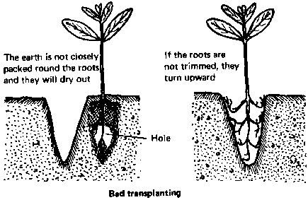 Plants are lifted from the nursery. But before transplanting them in the field, they must be prepared. Cut off roots that are too long. Cut off damaged roots. Take off half the leaves. Put the plant in the soil up to the base of the stem. Pack the earth well round the roots.