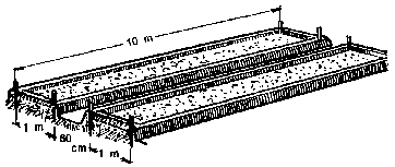 If the plot is large and flat enough, make your beds 10 metres long. Then you will have beds 1 metre wide and 10 metres long; that is, 10 square metres (m2). For each bed of 10 m2, add 30 kilogrammes of manure to the soil (roughly the contents of a wheelbarrow).