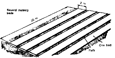 Then let the soil rest for 2 weeks. Break up clods of earth and remove weeds. When the soil is well tilled and quite loose, divide the nursery into strips 1.5 to 2 metres wide, 10 to 20 metres long, and 20 centimetres high.