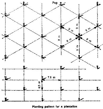 Trace lines across the slope and put in your pegs in straight lines; leave 7.8 metres between rows and 9 metres between pegs.