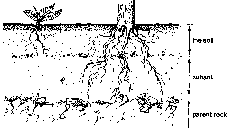 57. Below the soil is the subsoil. The subsoil is much harder than the soil. The roots of larger plants and trees get their water here.