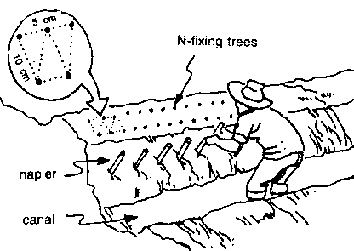 Plant the contour bunds with multipurpose shrubs/trees in a triangular form Planting napier grass on the hedgerow is not recommended because they compete with other crops for soil nutrients.